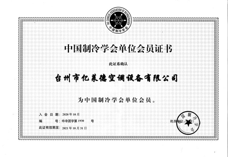 中國制冷學(xué)會單位會員證書