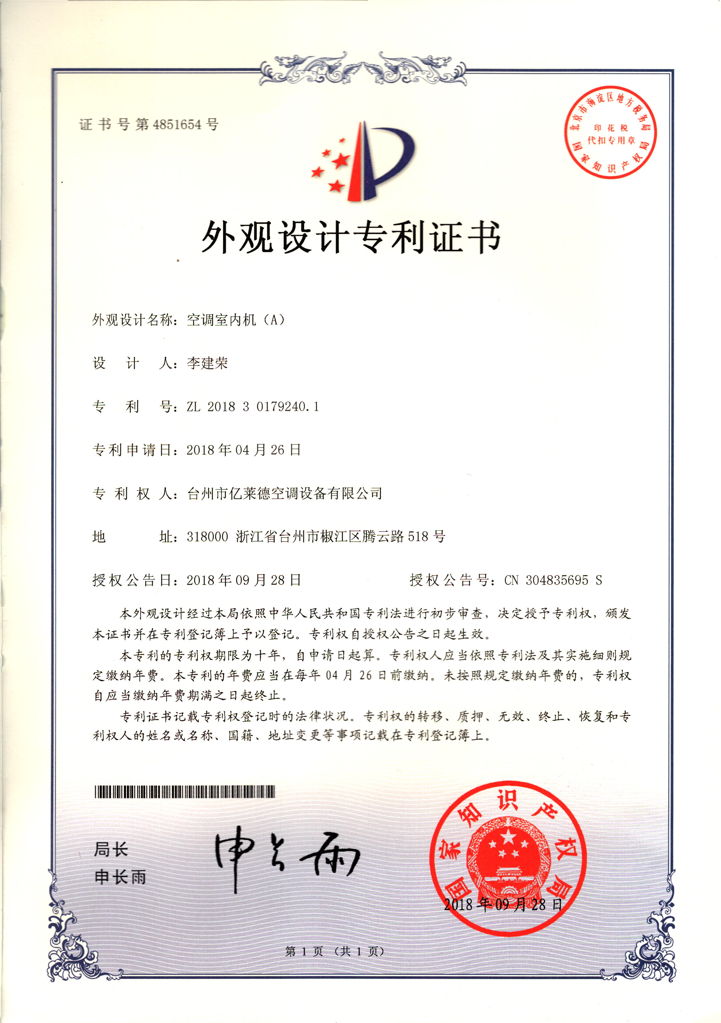 外觀設(shè)計專利證書--空調(diào)室內(nèi)機(A...