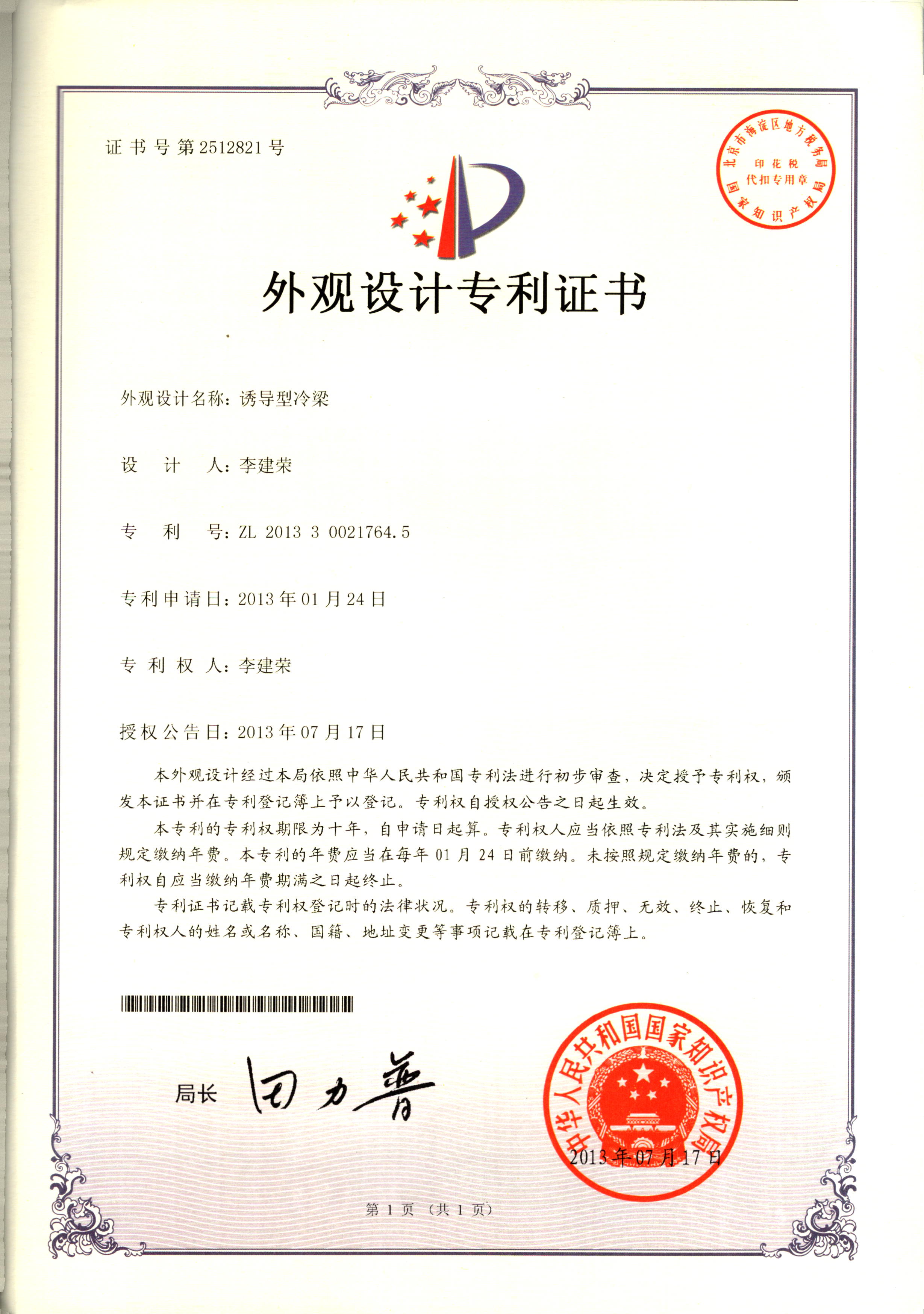 外觀設(shè)計專利證書--誘導(dǎo)性冷梁
