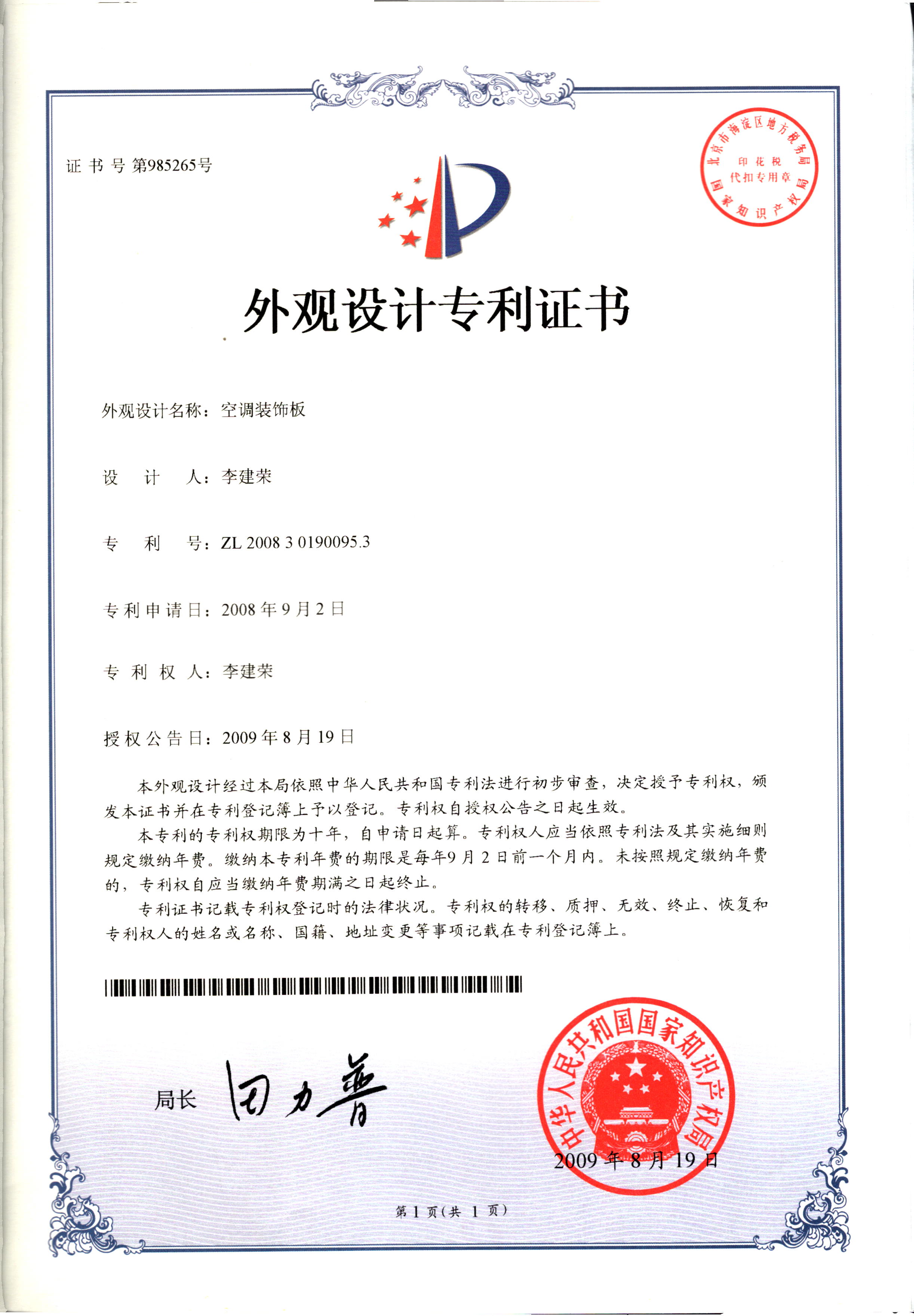 外觀設(shè)計專利證書--空調(diào)裝飾板