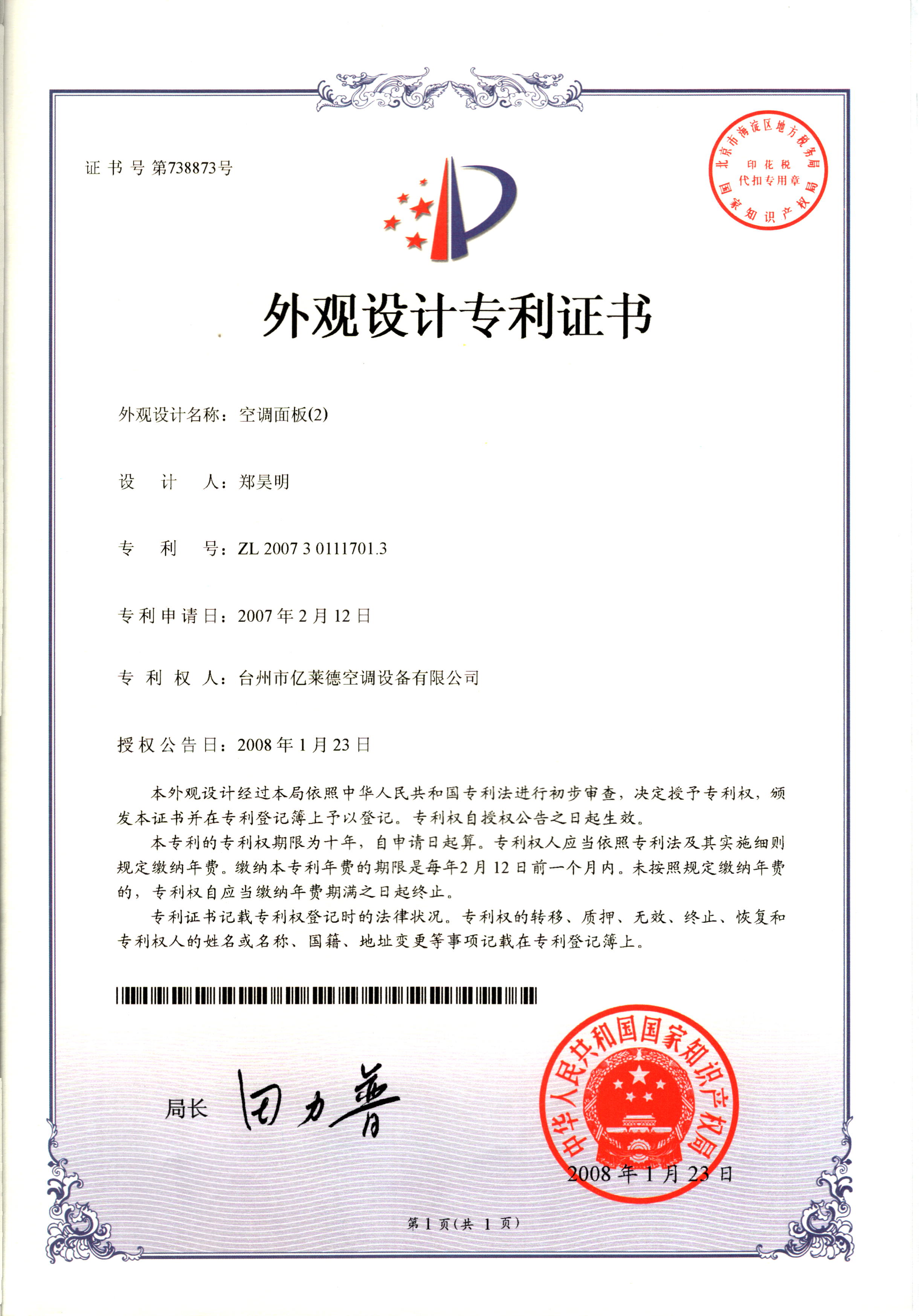 外觀設(shè)計專利證書--空調(diào)面板(2)