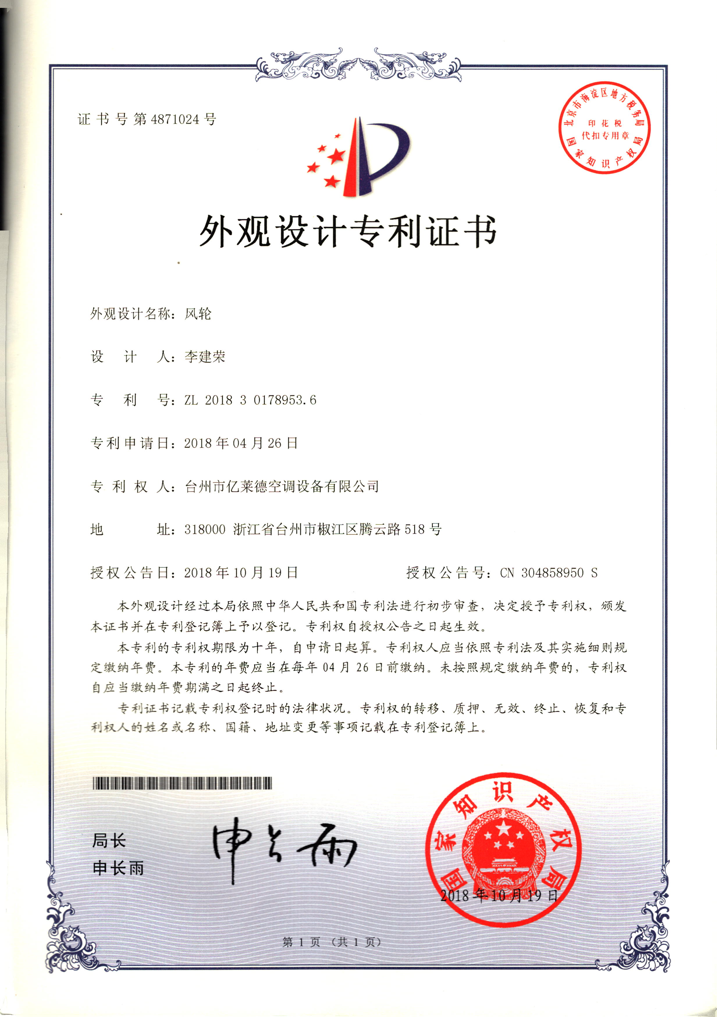 外觀設(shè)計專利證書--風(fēng)輪