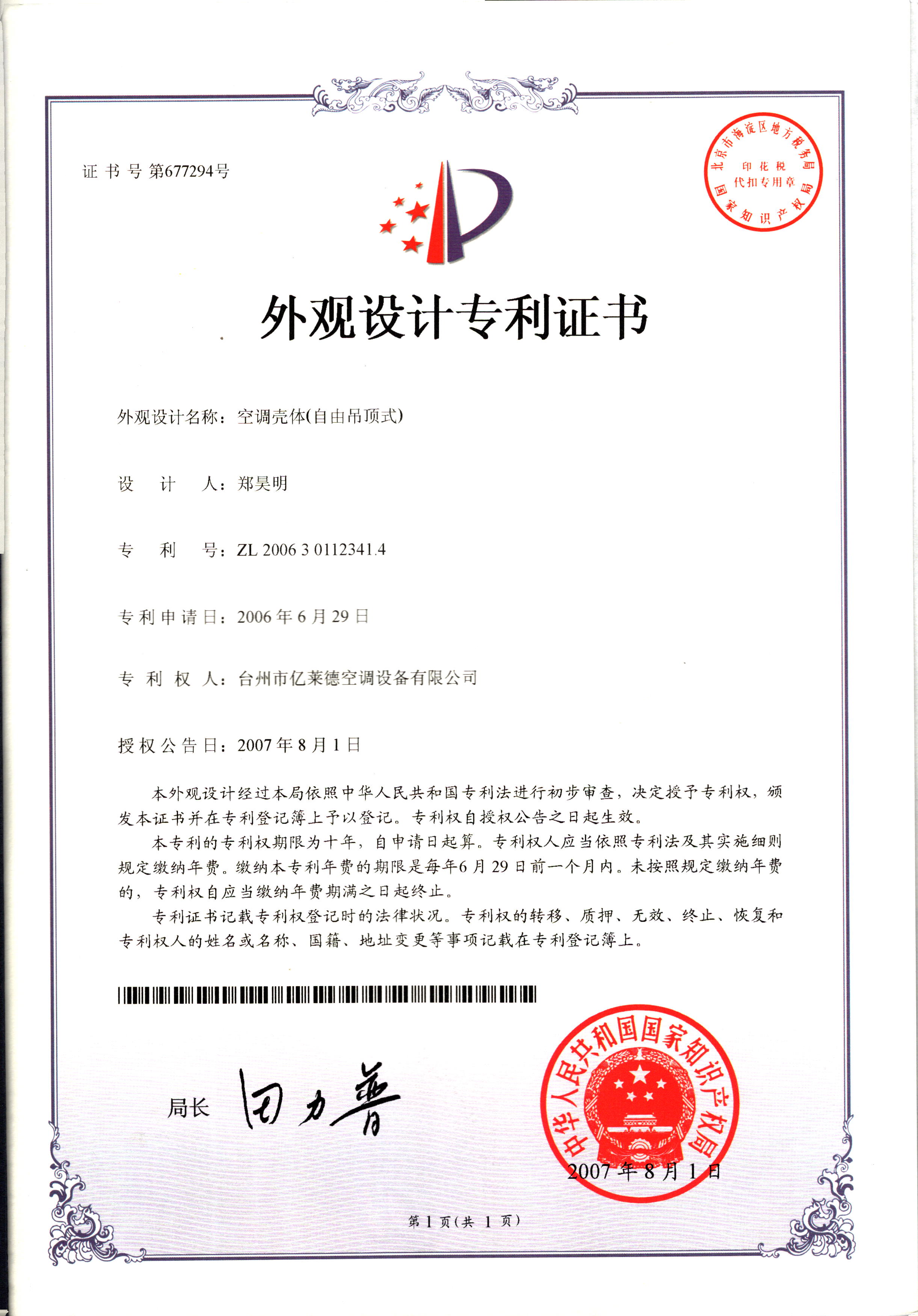 外觀設(shè)計專利證書--空調(diào)殼體(自由...
