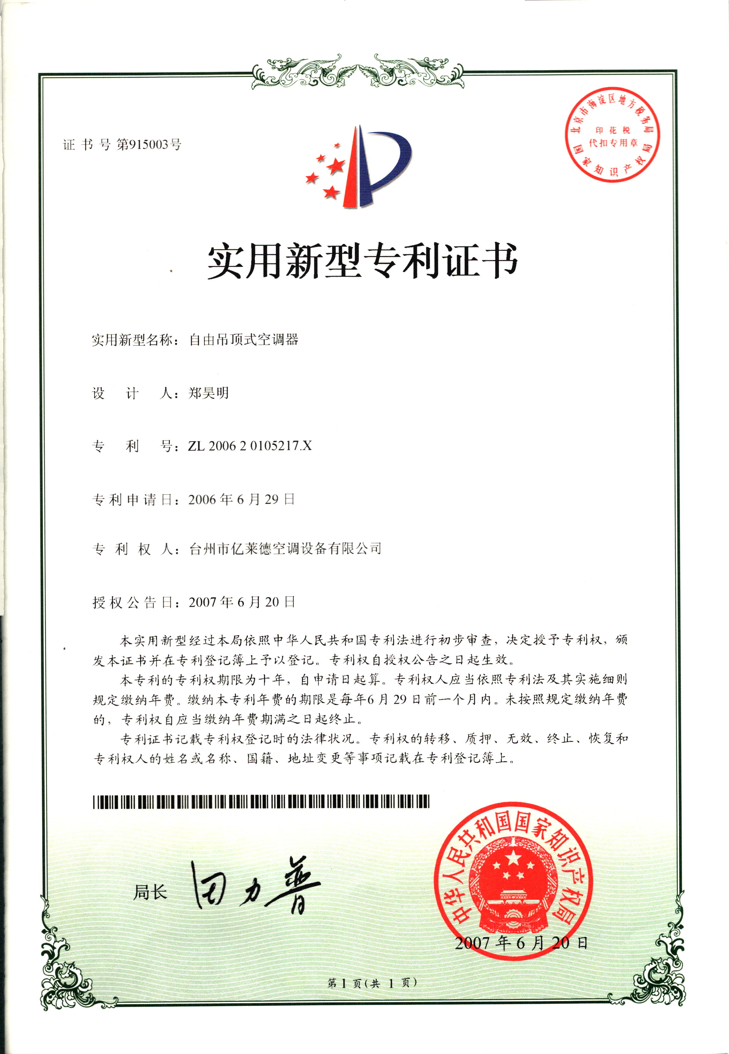 實用新型專利證書--自由吊頂式空...