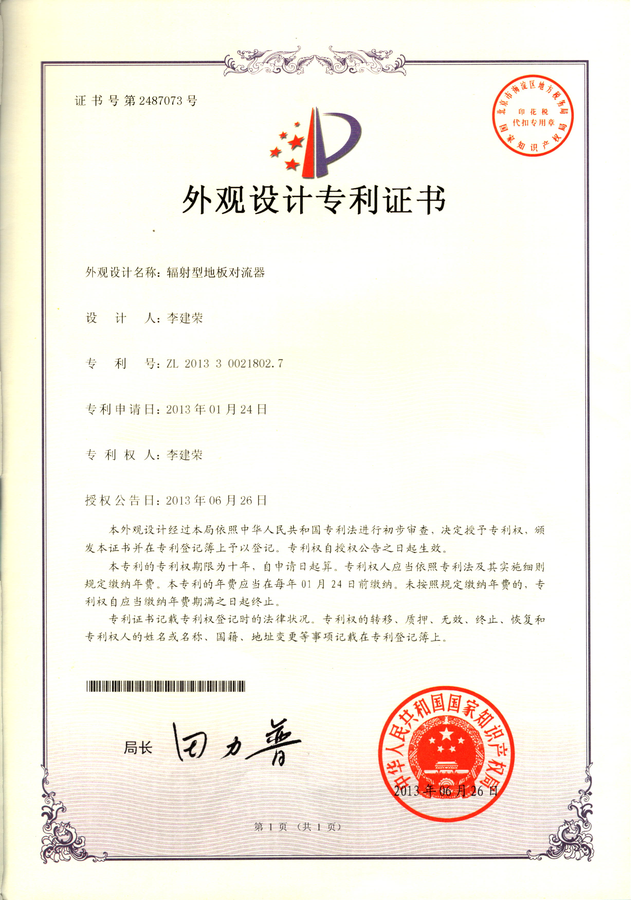 外觀設(shè)計專利證書--輻射型地板對...