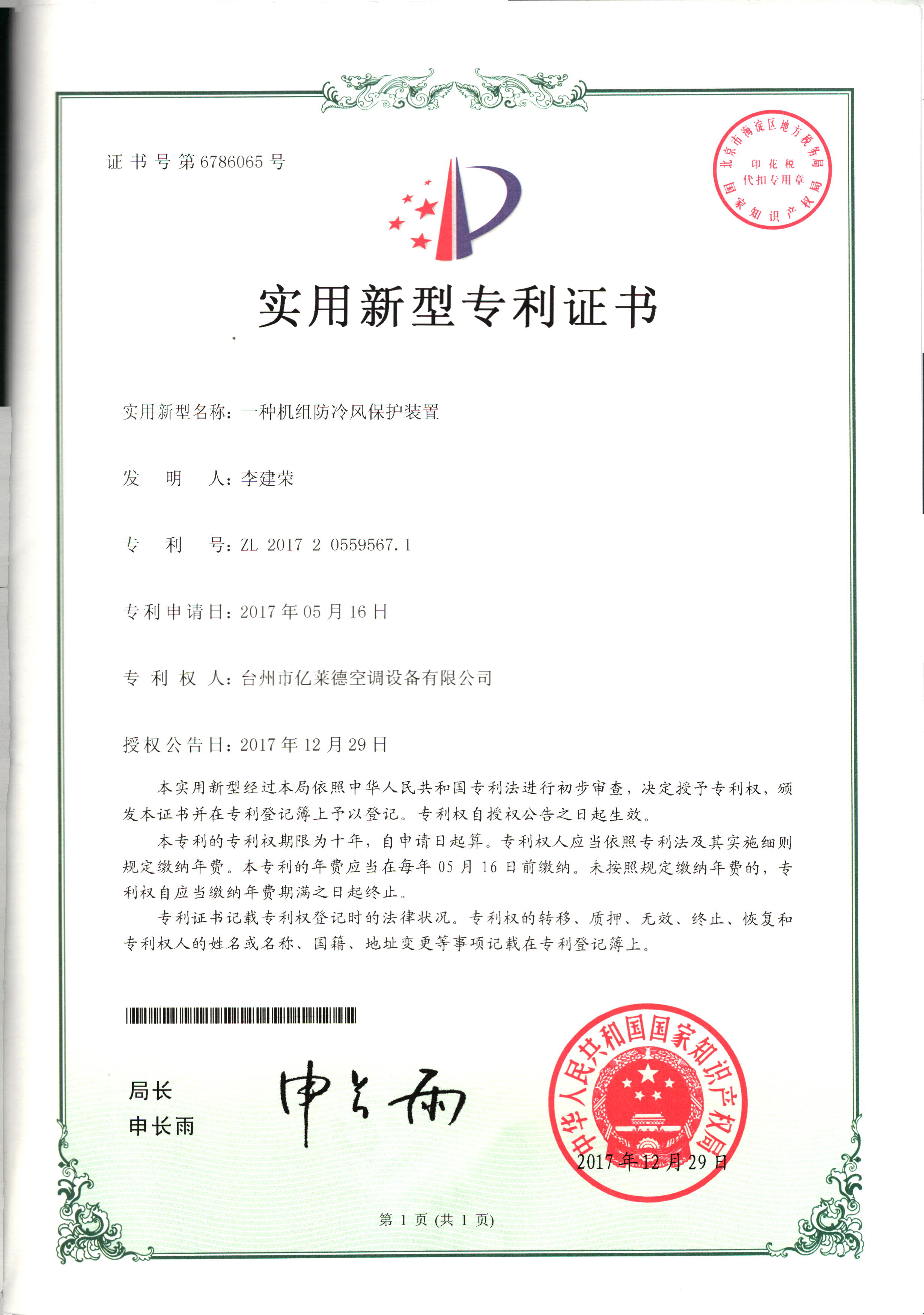 實用型專利證書--一種機組防冷風(fēng)...