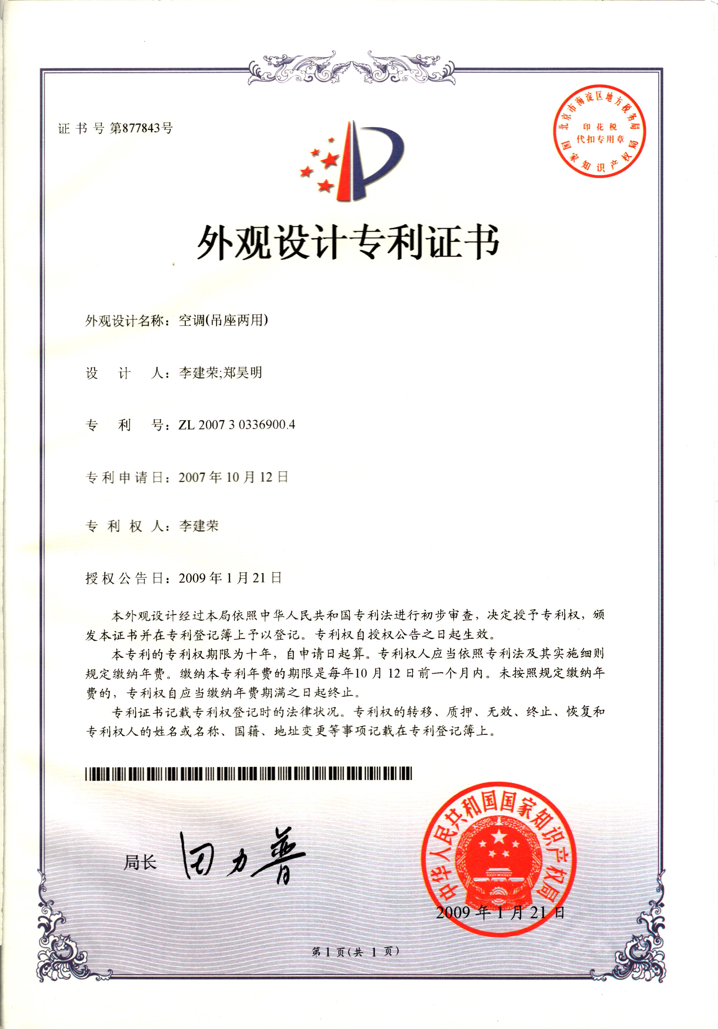 外觀設(shè)計專利證書--空調(diào)(吊座兩用...