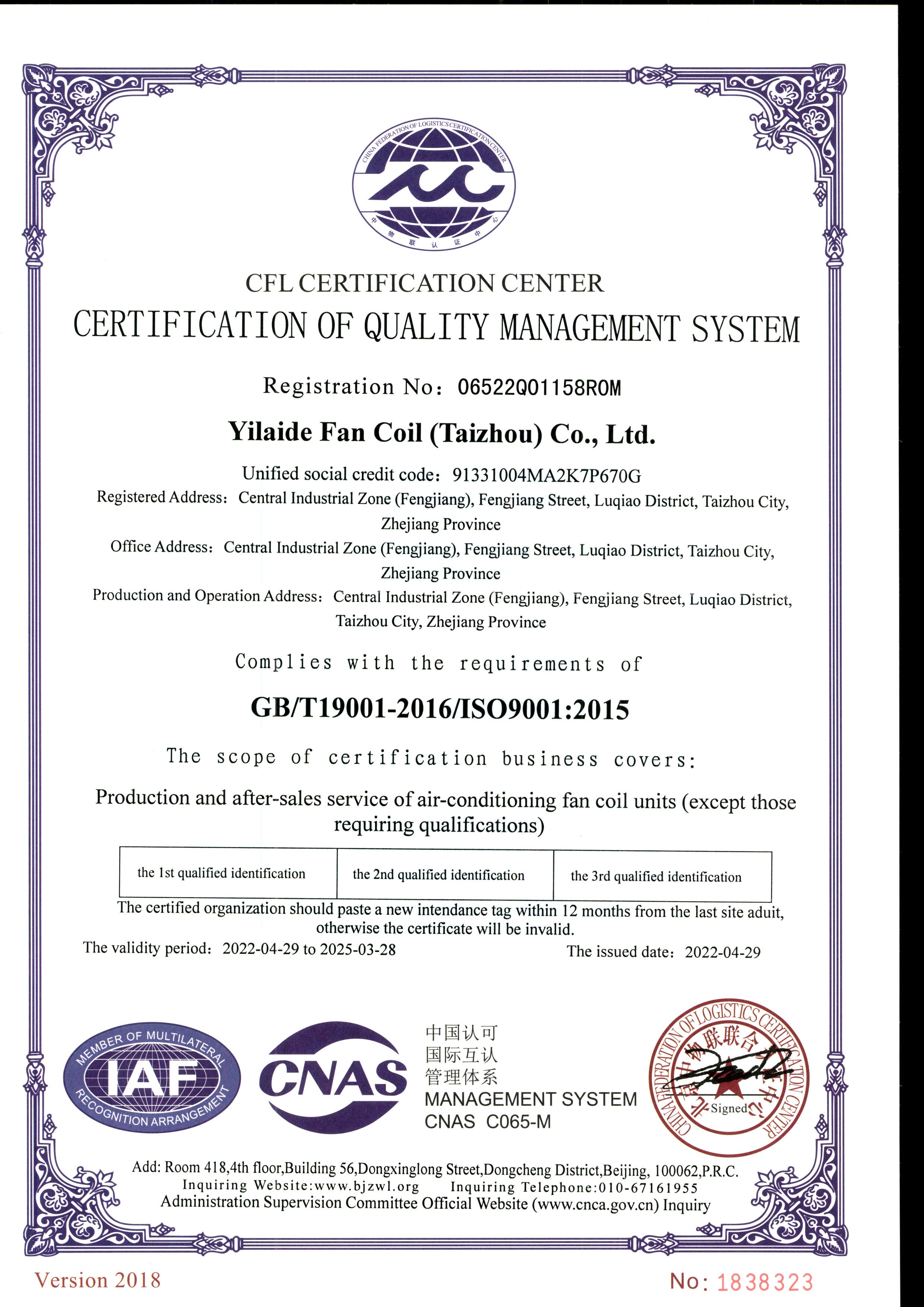 9001質(zhì)量體系認證證書