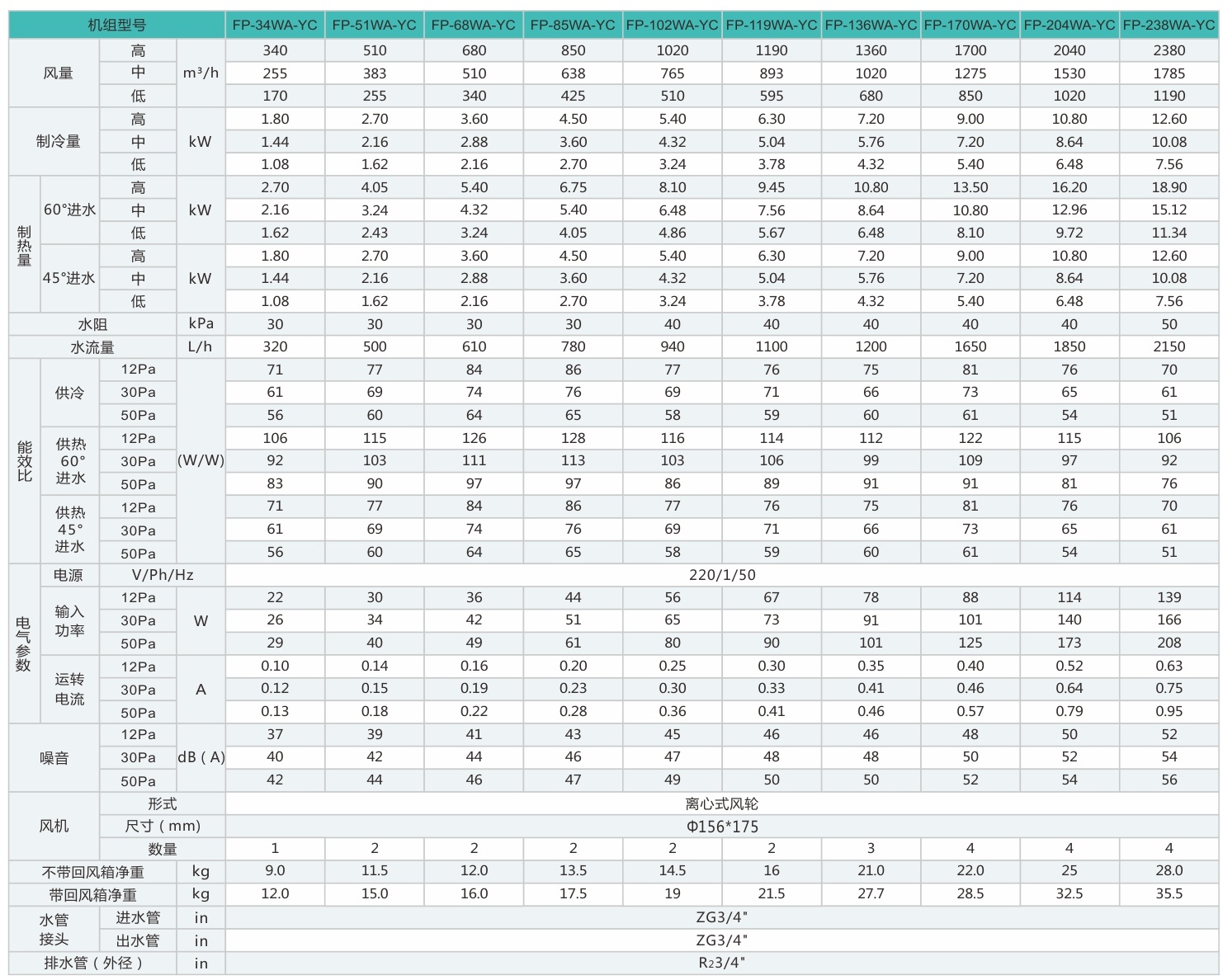 表中機(jī)組性能參數(shù)均在220V~/50Hz電源測(cè)試下所得。